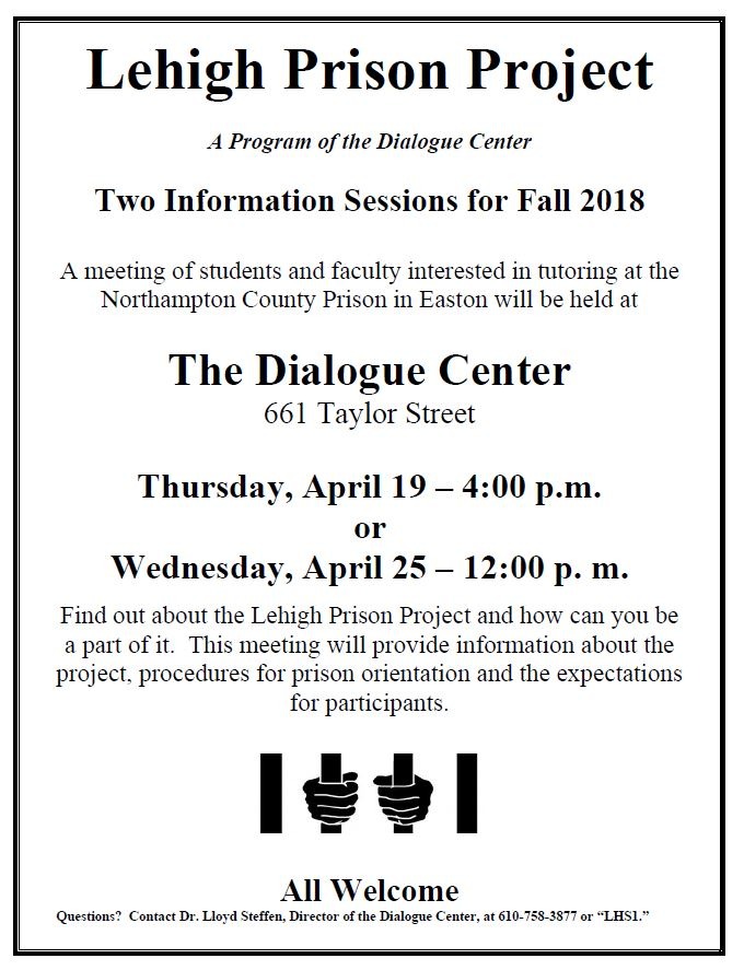 A meeting of students and faculty interested in tutoring at the Northampton County Prison. Thursday, April 19 @ 4:00p and/or Wednesday, April 25 @ 12:00 noon in The Dialogue Center, 661 Taylor Street.