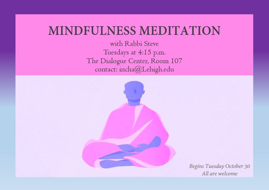 Join Rabbi Steven Nathan for 'Mindfulness Meditation' in the Dialogue Center on Tuesday, October 30th at 4:15p and each Tuesday thereafter at 4:15p through the end of the semester. Dialogue Center, Room 107.