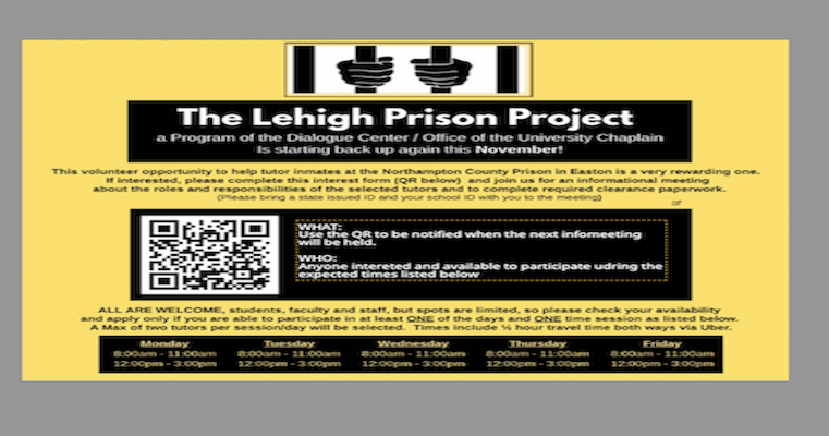 The Prison Project is offered to Lehigh students as a volunteer opportunity through the Office of the University Chaplain and the Center for Spirituality and Dialogue.